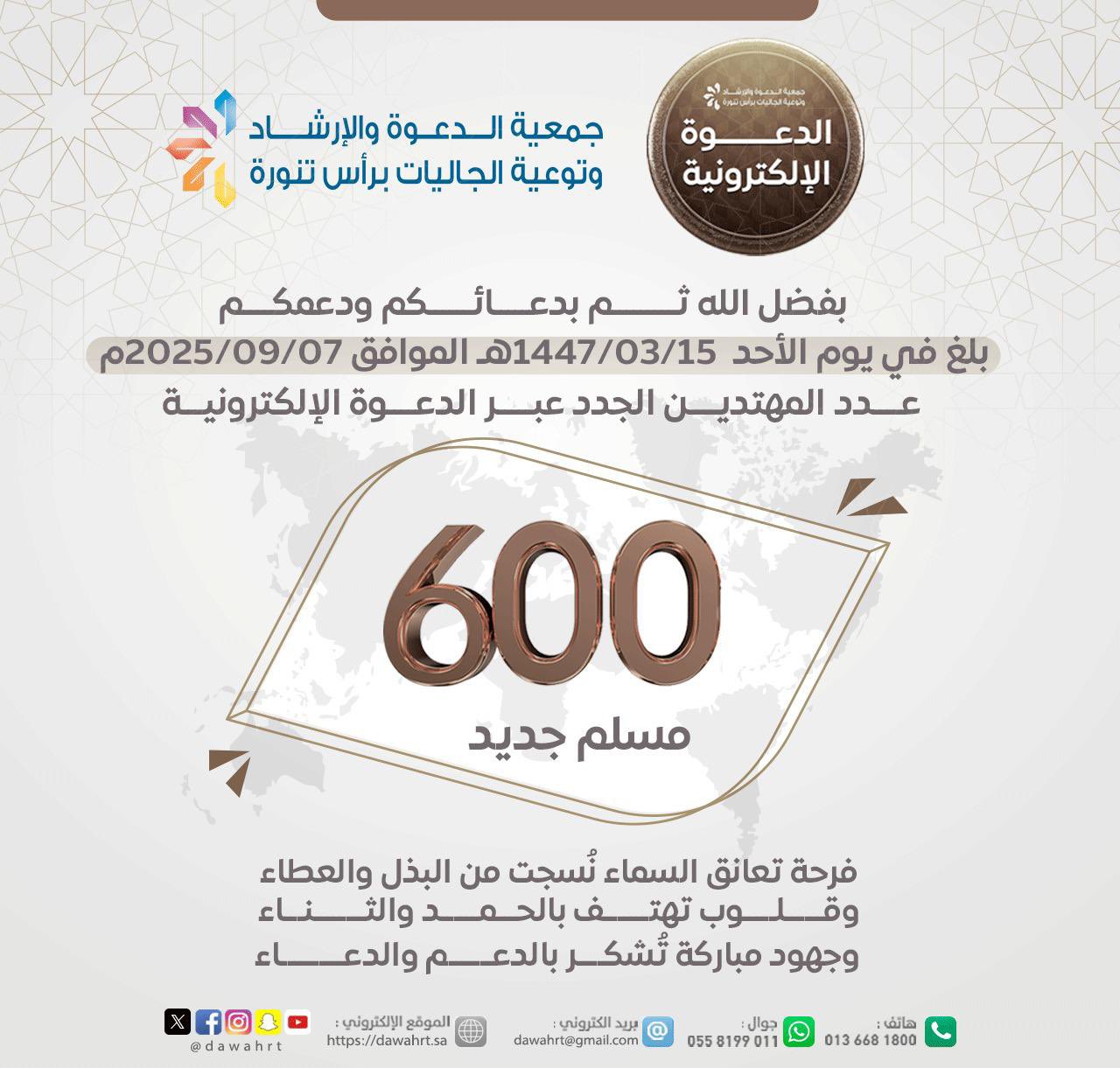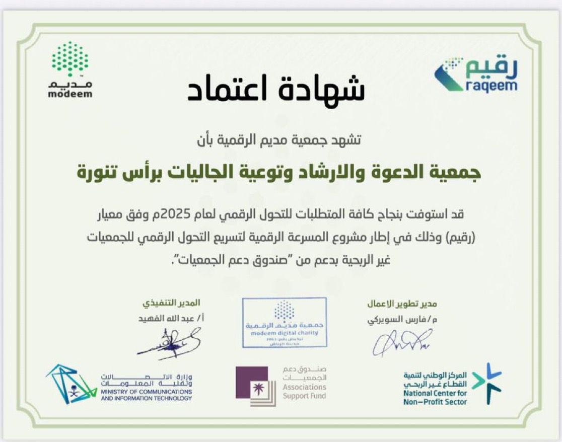 بحمد الله"حصلت جمعية الدعوة والإرشاد وتوعية الجاليات برأس تنورة على شهادة اعتماد ...